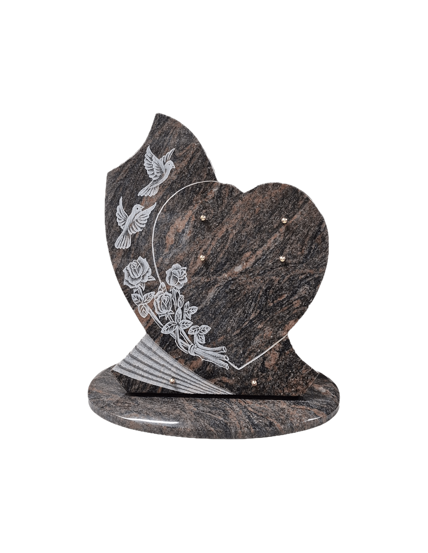 Plaque funéraire Cœur en granit Himalaya avec bouquet de roses et couple de colombe ( 40cmX 45cm) Grand format