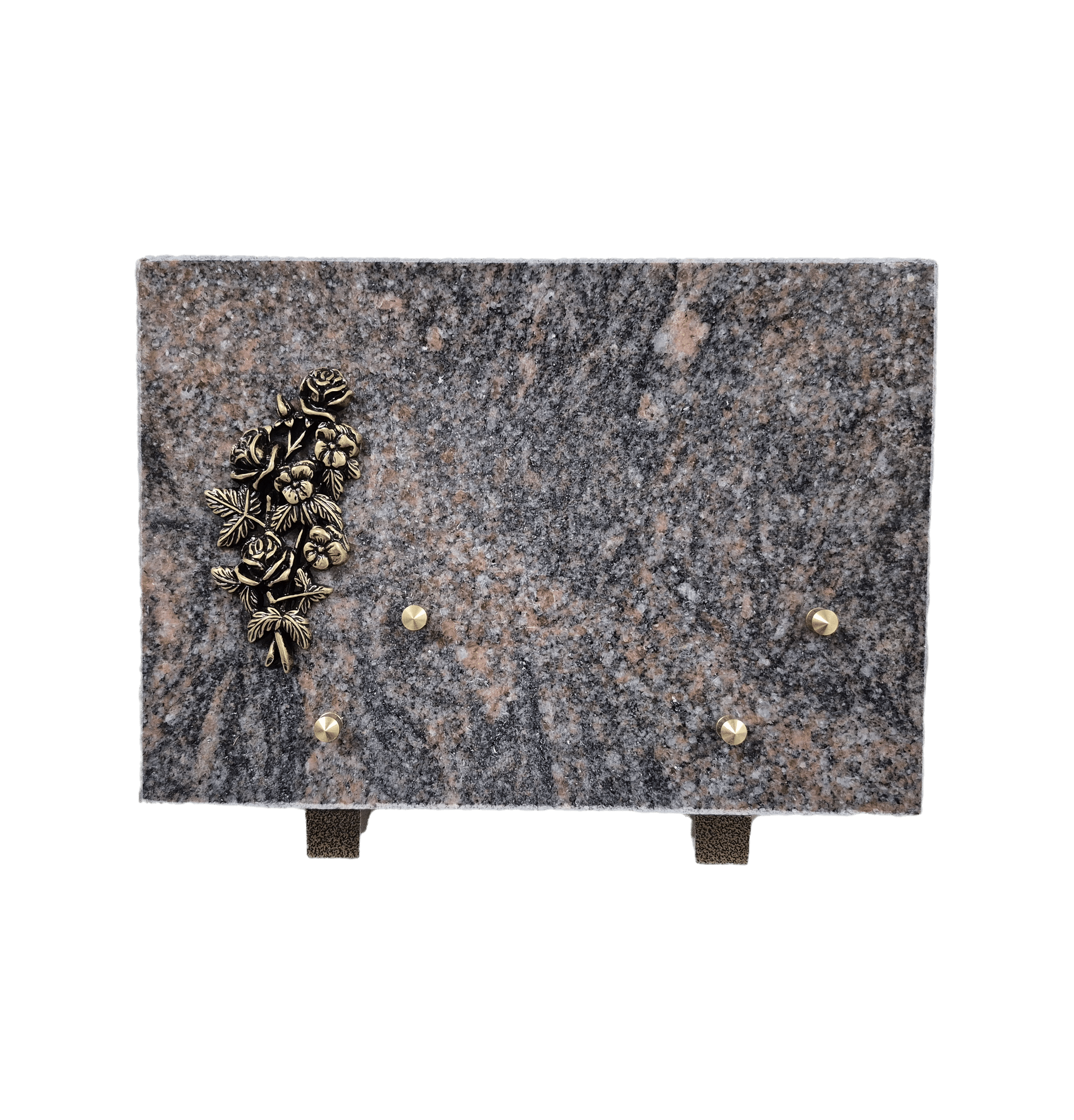 Cette plaque funéraire classique est en granit avec une texture marbrée mêlant des teintes roses, brunes et grises. Sur le côté gauche, elle est ornée d'une décoration en bronze représentant un bouquet de roses et de pensées, ajoutant une touche de délicatesse et de souvenir.