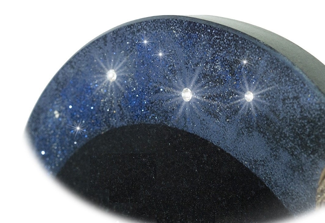 Plaque funéraire en granit Noir, avec décor d'un ciel étoilé (avec des cristaux et des paillettes, pour faire les étoiles).