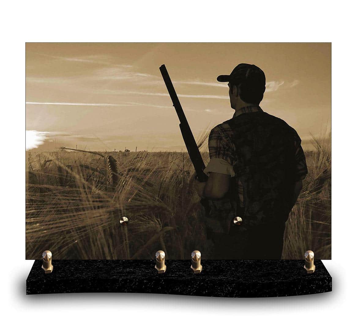 Plaque Funéraire moderne de forme rectangulaire, fabriquée en France, en altuglas avec l’image d’un chasseur de dos marchant dans un champ.