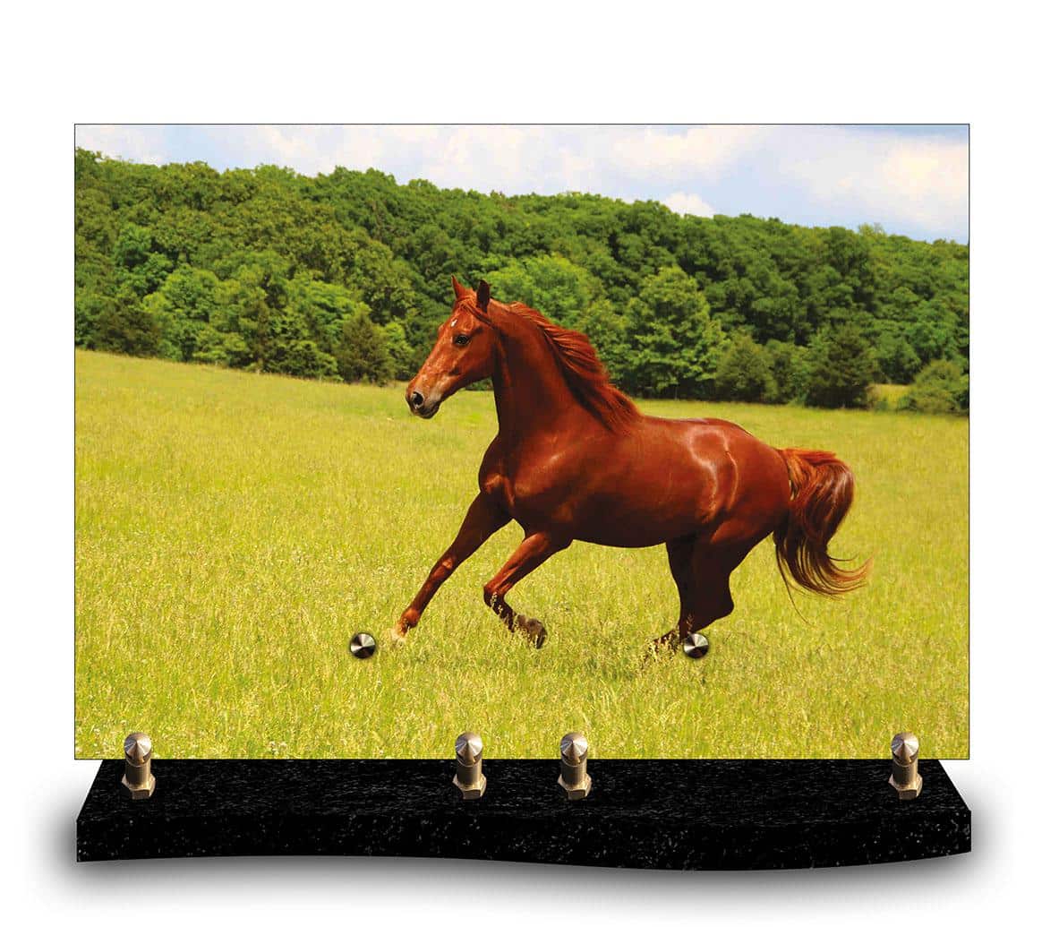Plaque Funéraire moderne de forme rectangulaire, fabriquée en France, en altuglas avec une image représentant un cheval brun galopant dans un herbage verdoyant.