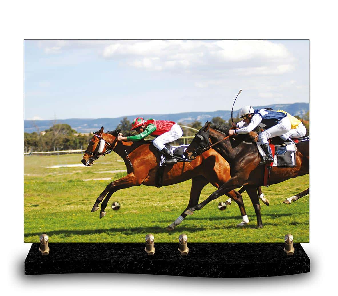 Plaque Funéraire moderne de forme rectangulaire, fabriquée en France, en altuglas avec l’image d’une course de chevaux.