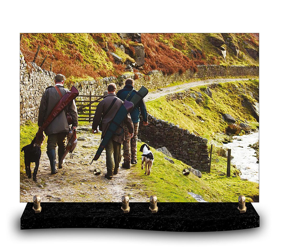 Plaque Funéraire moderne de forme rectangulaire, fabriquée en France, en altuglas illustrée avec une image montrant un groupe de chasseurs marchant avec leurs chiens sur un sentier.