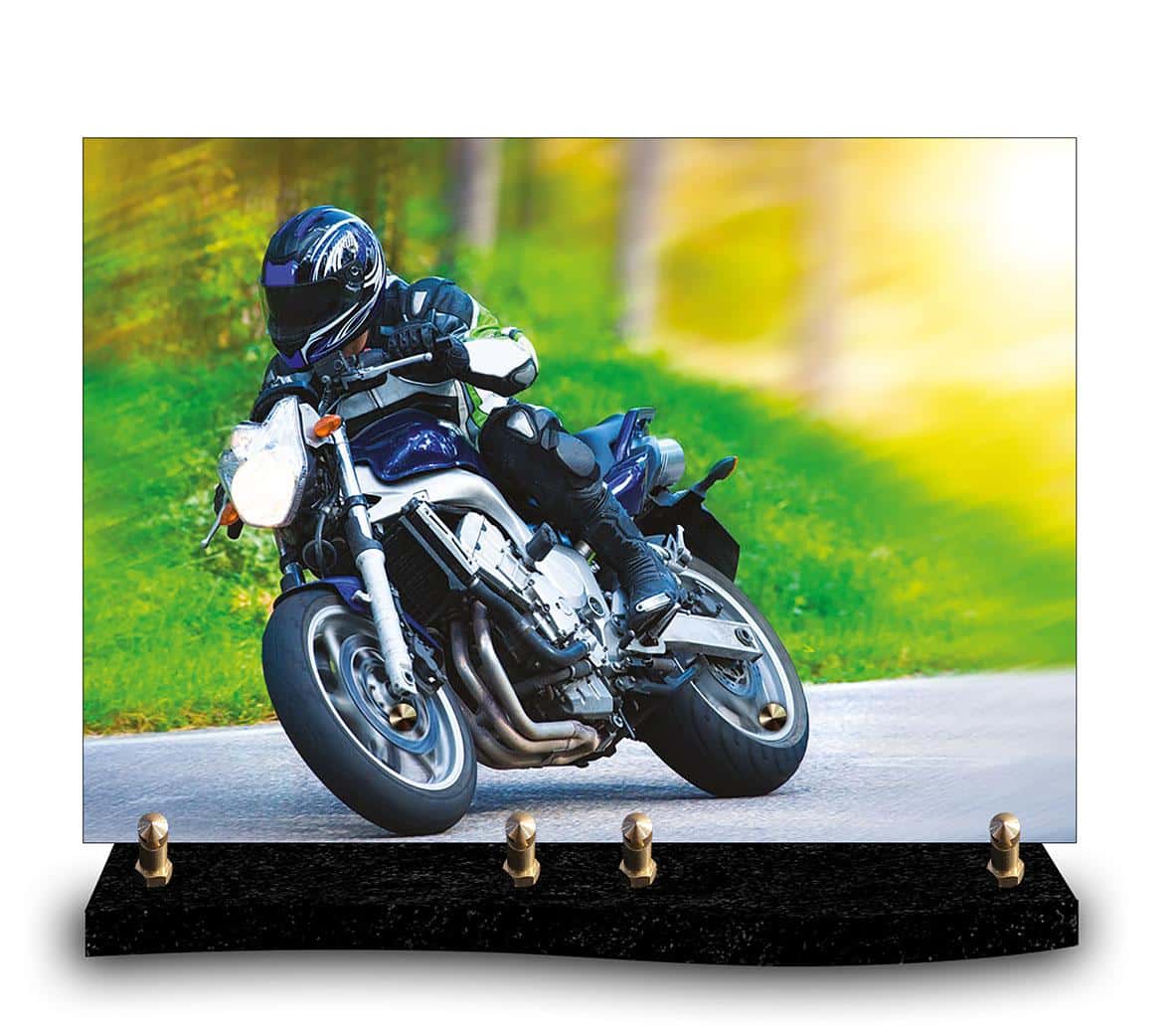 Plaque Funéraire moderne de forme rectangulaire, fabriquée en France, en altuglas avec l’image d’un motard au guidon de sa moto.