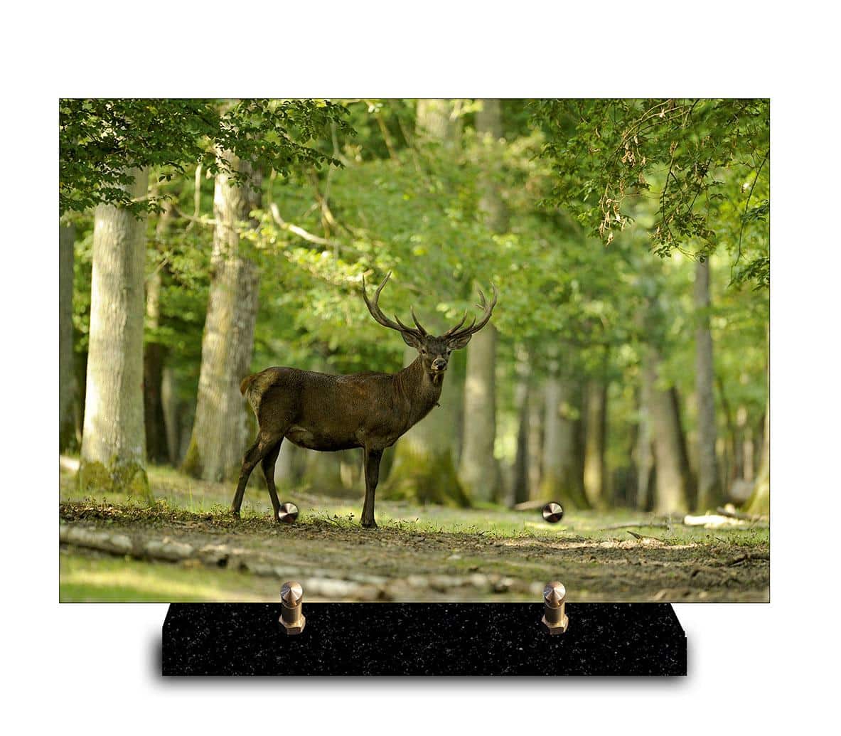 Cette plaque funéraire représente un cerf majestueux debout sur un sentier forestier. Il a de grandes bois imposants et semble attentif à son environnement. Autour de lui, la forêt dense et verdoyante est baignée par une lumière douce qui traverse les feuilles, créant une atmosphère paisible et sereine.