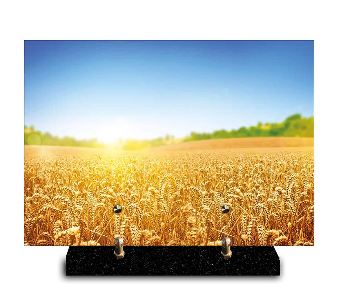 Cette plaque funéraire représente un vaste champ de blé doré sous un ciel bleu clair. Le soleil éclaire les épis, créant une atmosphère chaleureuse et paisible. À l'horizon, quelques arbres verts se détachent, offrant un joli contraste avec la mer dorée du champ.