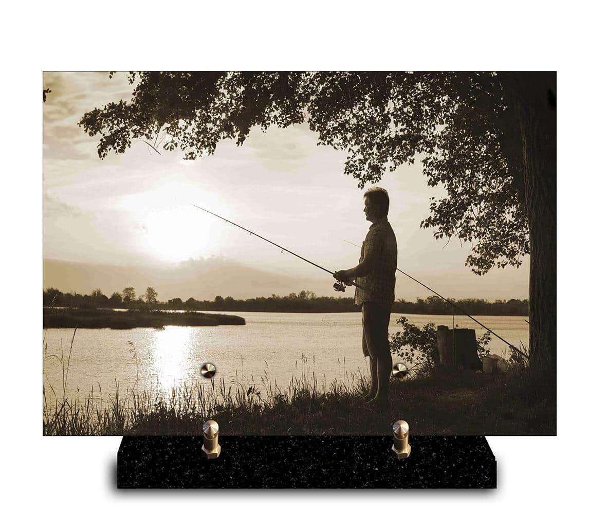 Plaque FunĂ©raire moderne de forme rectangulaire, fabriquĂ©e en France, en altuglas illustrĂ©e avec une image sĂ©pia montrant une personne en train de pĂȘcher au bord d’un lac ou d’une riviĂšre. La scĂšne est paisible, avec des arbres en arriĂšre-plan et une silhouette de pĂȘcheur se tenant debout avec une canne Ă pĂȘche.