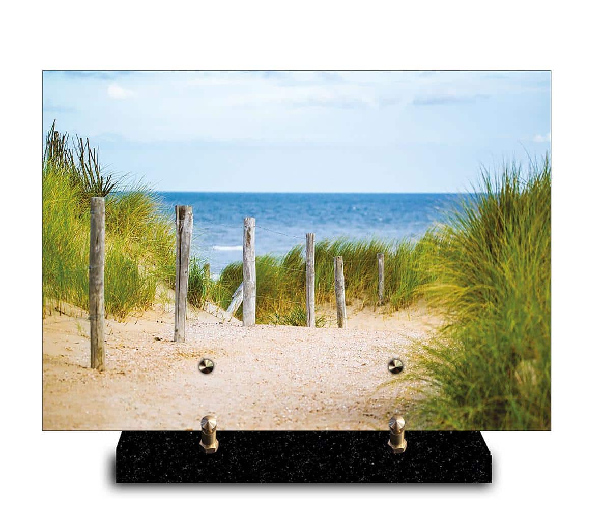Plaque FunĂ©raire moderne de forme rectangulaire, fabriquĂ©e en France, en altuglas avec lâimage d’un bord de mer. Cette plage pourra rappeler les temps joyeux passĂ©s en vacances ou tout simplement des ballades sur la cote.